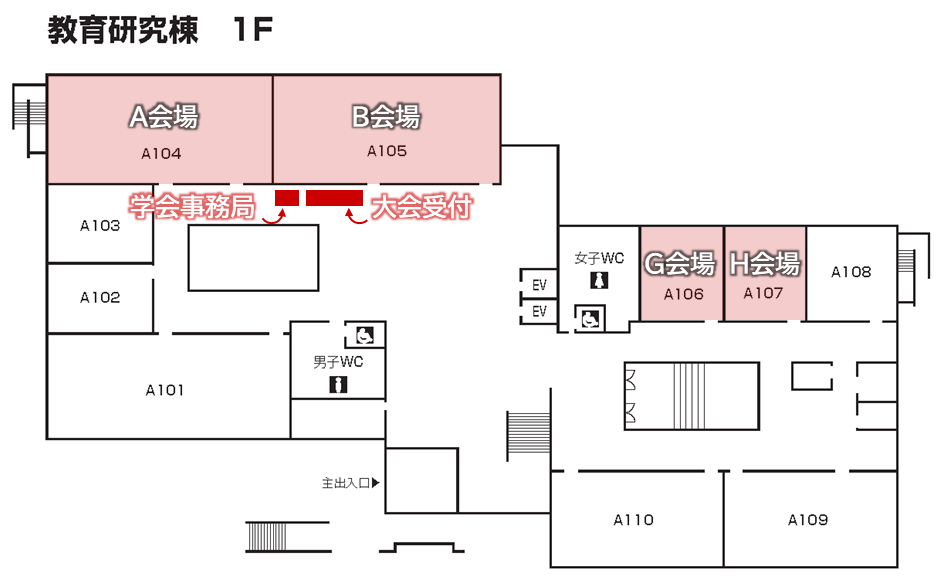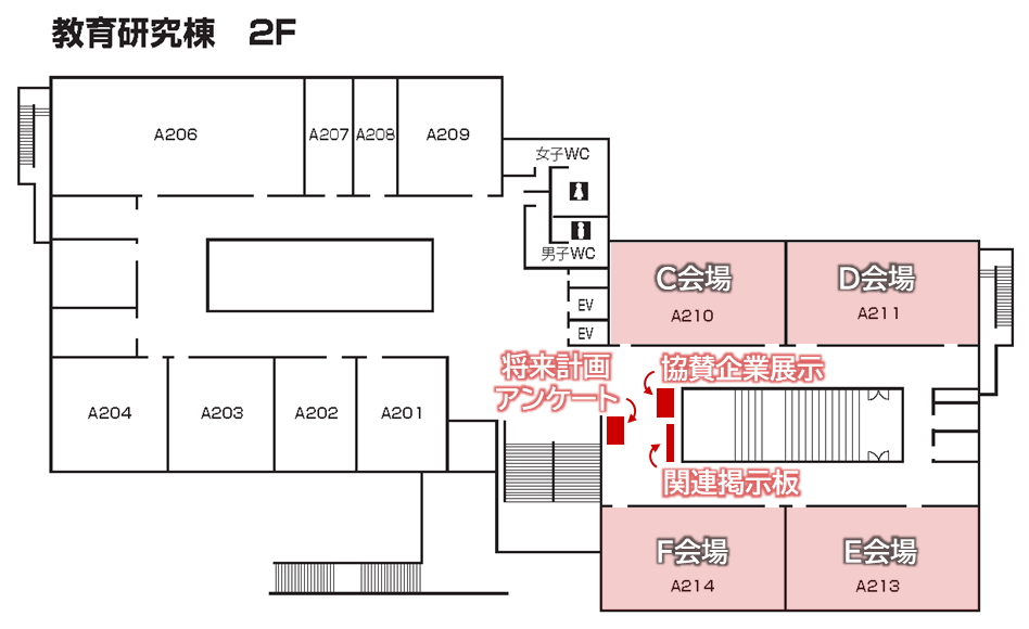 会場として利用するのは、教育研究棟1階と2階の6教室、および食堂になります。
